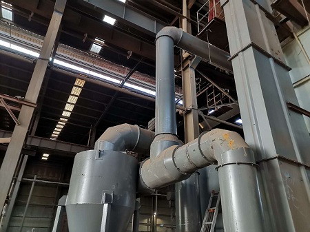 長沙格蘭肯接到衡陽某鑄造企業車間除塵的委托,經過細致現場數據測量和研討,認為是原來砂處理流水線在工作過程中未能將粉塵進行處理,造成開機后整個車間粉塵彌漫,環境非常惡劣。(如下圖)
