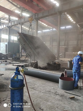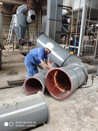 我們通過對粉塵產生過程的分析,除塵風量的計算,采集點的布置,設計了一套除塵系統。(工人認真安裝調試中,如下圖)